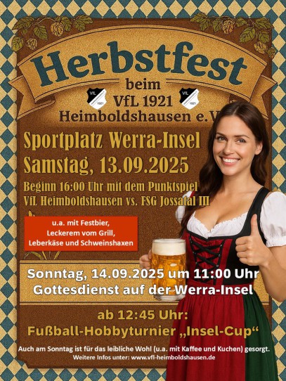am Samstag, den 13.09.2025 veranstaltet der VfL Heimboldshausen wieder sein traditionelles Herbstfest auf der Werra-Insel. Um 16:00 Uhr findet zunächst das Meisterschaftsspiel unserer Fussballer gegen die 3. Mannschaft der FSG Jossatal statt. Im Anschluss daran startet dann unser Herbstfest durch. Bei leckeren bayrischen Spezialitäten und Festbier möchten wir einen schönen und fröhlichen Abend zusammen verbringen. Der VfL Heimboldshausen lädt alle Mitglieder, Fans, Freunde und deren Familien recht herzlich ein, an dieser Veranstaltung teilzunehmen und mitzufeiern. Dirndl oder Lederhose sind natürlich keine Pflicht, gehören mittlerweile aber zum verbreiteten Bild auf unserem Herbstfest. Um besser planen zu können, bitten wir hinsichtlich der „bayrischen Essensspezialitäten“ um eine verbindliche, schriftliche Vorbestellung bis zum 06.09.2025 bei einem der Vorstandsmitglieder oder per Mail an "herbstfest@vfl-heimboldshausen.de".